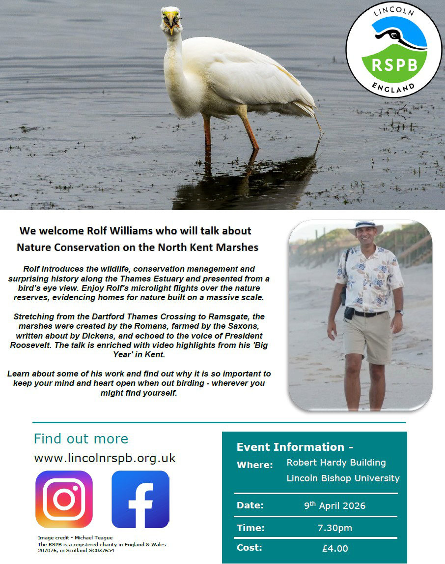 Nature conservation on the North Kent Marshes with Rolf Williams. This meeting has been kindly sponsored by a member of the RSPB. 7.30 pm in the Robert Hardy Building, Lincoln Bishop University, Longdales Road, Lincoln LN1 3DY. Admission charge £4. Please pay on the door.
